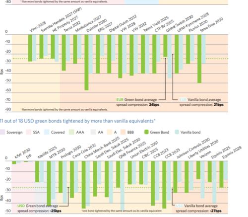 Greenium 久しぶりにClimate BondsのGreen Bond Pricingをみました。2020年下半期のデータです。2021年上半期のは来週ぐらいに公表されるそうです。 https://www.climatebonds.net/files/reports/cbi_pricing_h2_2020_01e.pdf EUR建てでは28のうち21,ドル建…